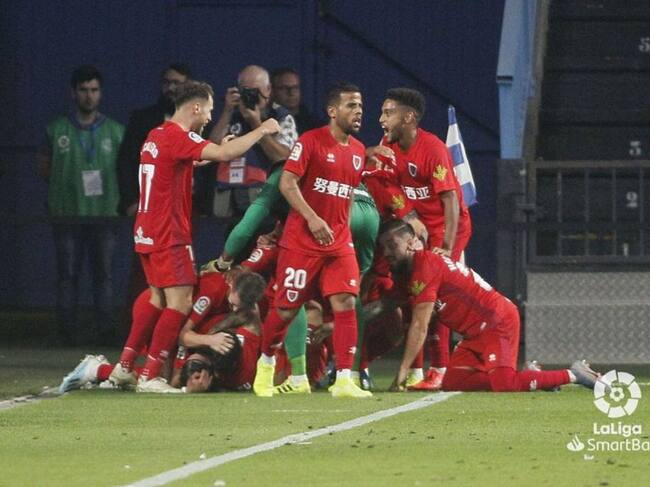 Los jugadores del Numancia celebran el tercer gol, marcado por Escassi. / laliga.es