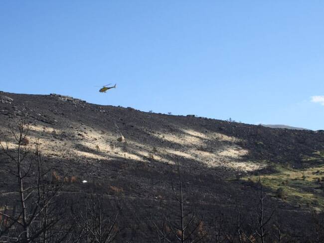 En aquellas áreas con pendientes elevadas, en las que no se puede hacer de forma manual, los helicópteros están procediendo en esta semana a realizar el extendido o acolchado de la paja de cereal. La experiencia de esta técnica ha demostrado su eficacia en la protección directa del suelo y para evitar riesgos erosivos, sobre todo en zonas vulnerables, como son aquellas en que el terreno ha quedado sin cobertura vegetal. Esta actuación es esencial para minimizar los aportes de cenizas y partículas de suelo a los citados arroyos.