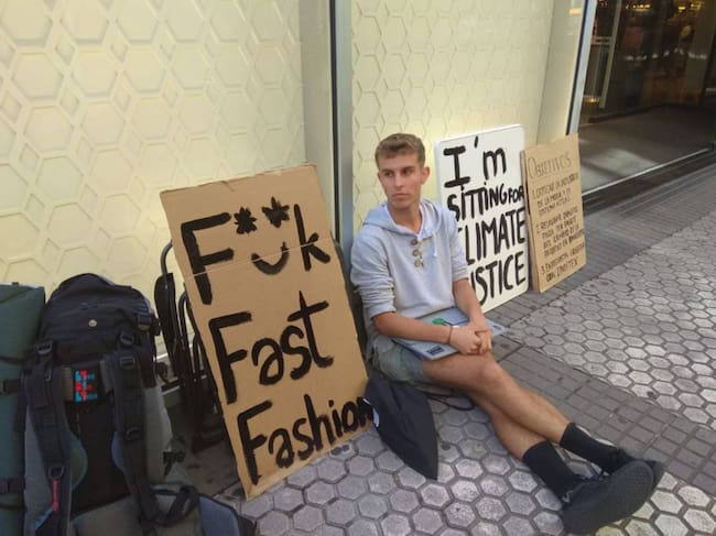 El joven activista Jon Kareaga denuncia, mediante esta sentada, el sistema insostenible de la industria textil