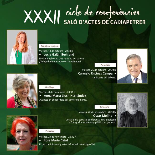La pediatra y escritora Lucía Galán Bertrand, el periodista Carmelo Encinas Campa, la oncóloga Anna María Lluch Hernández, el fotógrafo Óscar Molina y la periodista Rosa María Calaf son los cinco nombres que integran el cartel de las XXXII edición de ciclo de conferencias Otoño Cultural de Petrer.