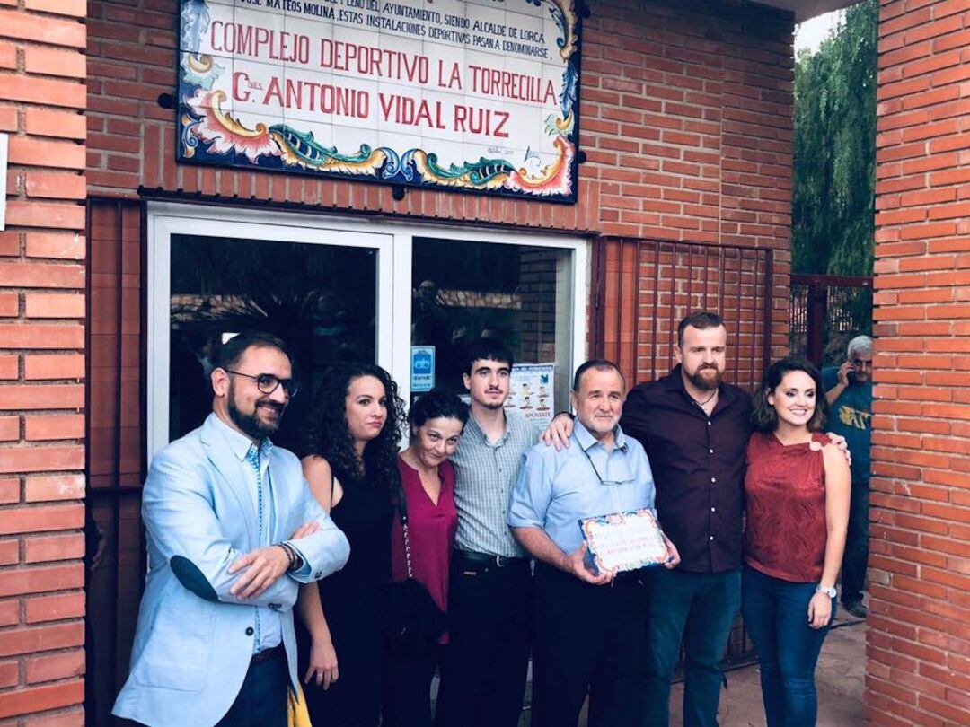 El Complejo Deportivo de La Torrecilla luce ya el nombre de 'Ginés Antonio Vidal', el que fuera concejal de Deportes del Ayuntamiento de Lorca, que asistió emocionado junto a su familia al acto en el que se descubrió la placa con su nombre en estas instalaciones.