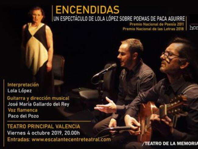 La obra está programada para el viernes 4 de octubre en el Teatro Principal y es un emotivo diálogo entre teatro y poesía protagonizado por Lola López, que está acompañada en directo por una de las máximas figuras de la guitarra a nivel nacional e internacional, el maestro José María Gallardo del Rey, y la voz flamenca de Paco del Pozo, ambos artistas amigos íntimos de la poeta