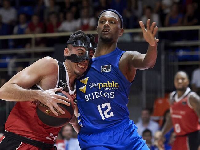 El fuenlabreño Marc García (i) ante Thad McFadden durante el partido de Montakit Fuenlabrada ante San Pablo Burgos de la primera jornada. / ACB Photo - BB Hojas