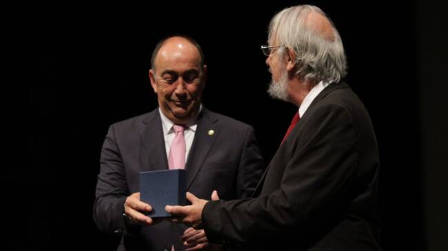 El presidente de la Diputación Miguel Ángel de Vicente junto al presidente de la Fundación Ramón Menéndez Pidal Jesús Antonio Cid sobre el escenario del Juan Bravo / Radio Segovia