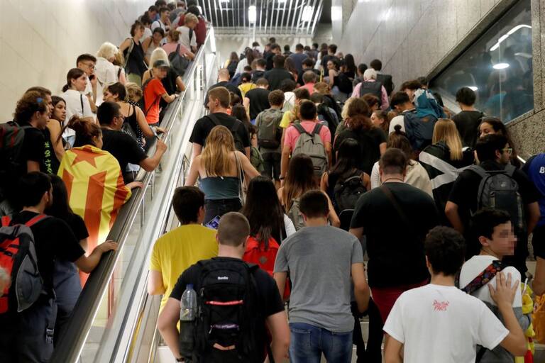 Centenares de personas se dirigen en metro al Aeropuerto de El Prat
