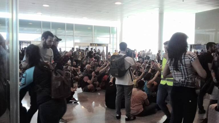 Manifestantes en la terminal T1 del aeropuerto del Prat