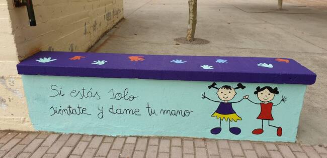 Con frases como ‘Si estás solo siéntate y dame tu mano’, ‘tener tu amistad es un regalo’ o ‘Friends forever’, porque el centro es bilingüe, el CEIP Enrique Tierno Galván de Puertollano inaugura hoy su espacio contra el acoso escolar y bullying. Un espacio que son en concreto dos poyetes muy transitados y dos bancos , que se han ilustrado y rotulado con frases como las anteriores y con dibujos que trasladan un mensaje de amistad y compañerismo. Cecilia Gallego, jefa de estudios del colegio, lo ha explicado en Cadena SER