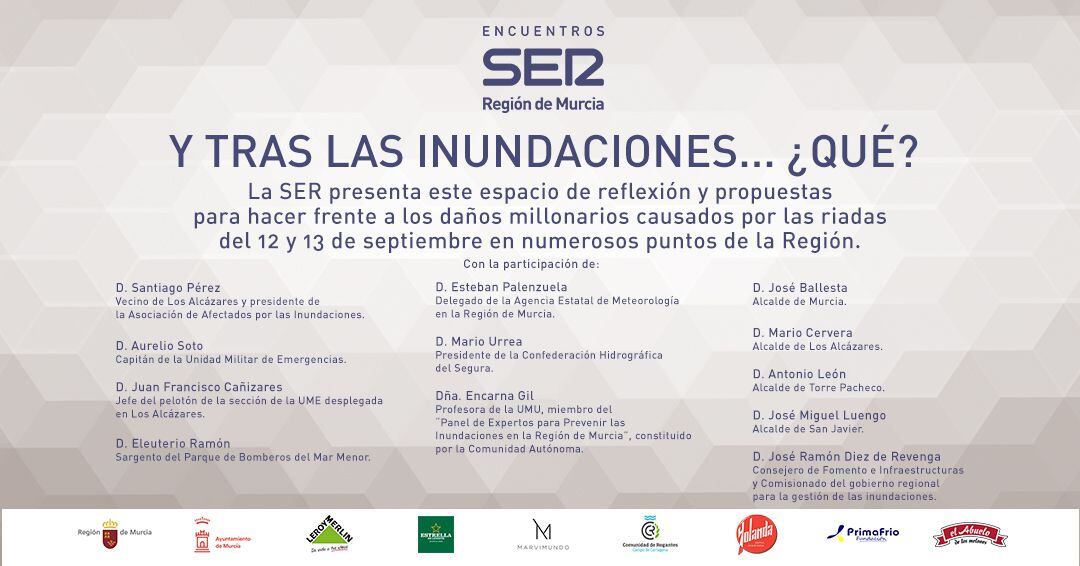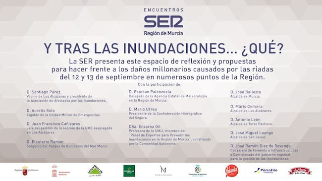 "Y después de las inundaciones... ¿Qué? es un espacio de reflexión, organizado por la Cadena SER en la Región de Murcia, para recabar propuestas con las que hacer frente a los daños millonarios causados por las riadas del 12 y 13 de septiembre en numerosos puntos de la Comunidad autónoma de la Región de Murcia.
