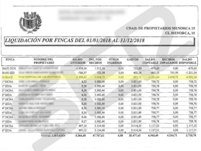 Según las actas de la comunidad de propietarios, a la que ha tenido acceso la SER, hasta el 31 de diciembre de 2018, Iván Espinosa de los Monteros debía 4.992,38 euros. Durante ese año se les acumularon los recibos impagados. En total, debían 16 mensualidades, cada una de ellas por un importe de 266,19 euros por gastos de contribución y otros gastos derivados de la comunidad por otros 66,11 euros.