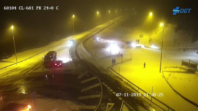 La nieve está dificultando a esta hora de la noche la circulación en la CL 601 en la subida al Puerto de Navacerrada a la altura de la Pradera de Navalhorno desde el kilómetro 17 al 24. Está prohibida la circulación para camiones y articulados.