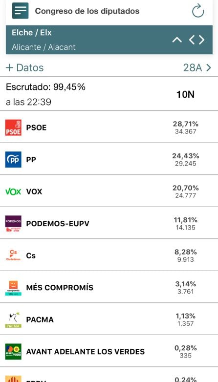 Nueva cita electoral y aunque la foto a vista de pájaro puede parecer muy similar a la del 28 A, en Elche se ha producido un cambio muy significativo en el electorado. VOX se ha convertido en la tercera fuerza más votada, también en Elche, superando a Ciudadanos y a Unidas Podemos.