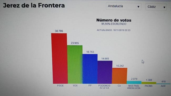 Con el 84% del voto escrutado, el PSOE gana las elecciones de este 10 de noviembre en Jerez con más de 27.000 votos, el 30% del total. La segunda fuerza politícia más votada ha sido Vox que sube de la quinta posición de los comicios del pasado 28 de abril tras conseguir ahora el 22% de los votos.