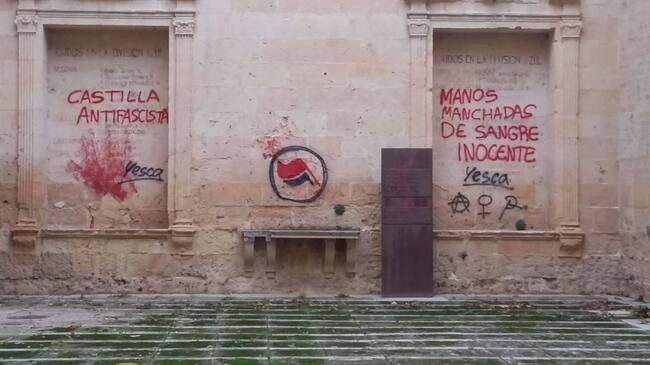 En la mañana del domingo aparecían pintadas antifascistas en las ruinas de la antigua iglesia de San Agustín. El régimen franquista aprovechó el ábside, poco después de la construcción del Policlínico 18 de julio, para erigir un monumento que honrara a los segovianos que defendieron el bando nacional durante la guerra civil. El Colectivo Yesca ha subido a sus redes sociales un video realizando las pintadas.