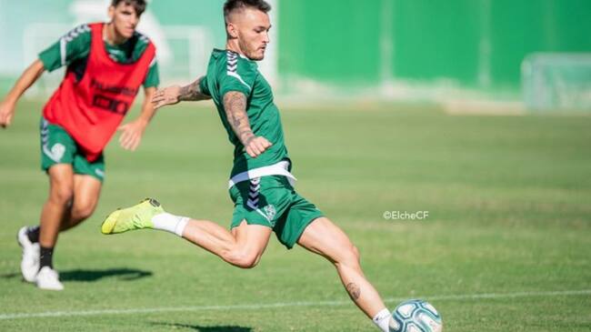 Josan se dispone a golpear el balón en un entrenamiento del Elche / Sonia Arcos