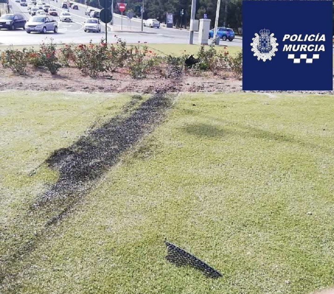 Agentes del Grupo Motorista de la Policía Local de Murcia interceptaron este domingo un turismo cuyo conductor tras perder el control, saltó el bordillo y cruzó la rotonda de Media Markt en la ciudad, resultando herido por impacto del airbag y dejando un reguero de aceite.