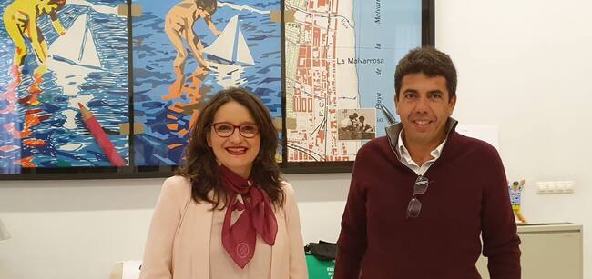 La vicepresidenta Mónica Oltra y el presidente de la Diputación, Carlos Mazón, en el encuentro que han mantenido esta mañana en Valencia para poner fecha a la Comisión Técnica para la coordinación de los servicios sociales. / GVA