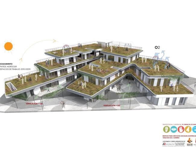 La forma en planta del edificio libera al máximo la planta baja para generar una plaza ajardinada que se abre al entorno urbano a modo de vestíbulo. En esta plaza se desarrollará gran parte de las actividades del centro y estará dotada de distintas texturas, señales luminosas, auditivas y vegetación para el trabajo de las distintas discapacidades.