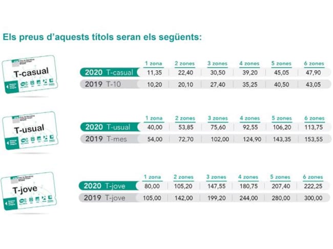 En canvi, la T-Mes i la T-Jove seran a partir del mes de gener un 25% més barates. La primera ja no es dirà T-Mes, sinó T-Usual i les administracions volen que sigui el títol de referència a partir d’ara. Aquesta nova targeta costarà un 25 per cent menys i tindrà les mateixes característiques que la T-Mes: es un títol personalitzat i de viatges il·limitats durant 30 dies. Si parlem dels usuaris d’una zona, ara estan pagant 54 euros i a partir de l’1 de gener en pagaran només 40.