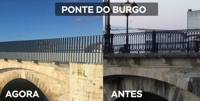 Avanzan los trabajos de colocación de la nueva barandilla en el puente de O Burgo que sustituye a la antigua. Es algo más moderna y ya ha creado polémica.