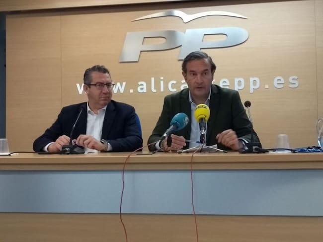 El secretario general del PP, Toni Pérez, (i) y el diputado autonómico, Nando Pastor (i), en la presentación de las enmiendas a la provincia que llevarán al debate en Corts. / Sonia Martín