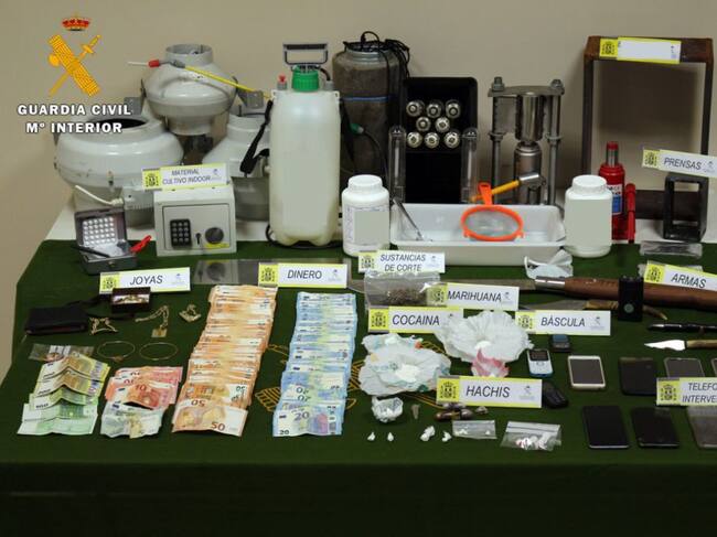 Fruto de los registros efectuados, además de la detención de los nueve integrantes del grupo, ha intervenido más de 300 dosis de cocaína de gran pureza; cuatro coches, dos de ellos de alta gama; más de 10.000 euros, supuestamente producto de la venta del estupefaciente; gran cantidad de útiles para la confección de papelinas, como balanzas de precisión, dos prensas hidráulicas, moldes, planchas metálicas y sustancia de corte, así como material suficiente para constituir una plantación interior de marihuana, numerosas joyas, y otros objetos todos ellos provenientes del tráfico de drogas o que habían sido supuestamente adquiridos con las ganancias obtenidas por la venta de la droga.