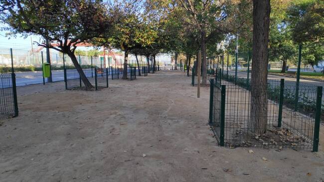 La parcela está rodeada de un seto y una verja de 2 metros de altura para evitar que se escape cualquier perro. Dispone de arbolado protegido, riego por goteo, alumbrado, bancos, papeleras y dos fuentes bebedero.