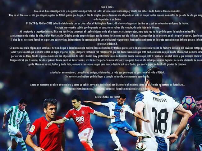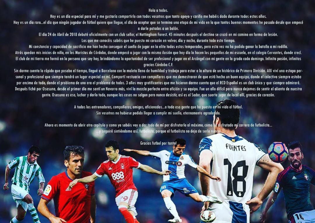 Juan Rafael Fuentes se ha despeido del fútbol tras no superar la lesión de rodilla sufrida en tierras inglesas. Tras pasar por equipos como Osasuna, RCD Español... Fuentes pone fin a su carrera con el siguiente comunicado: