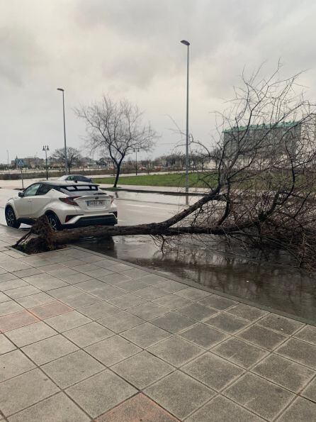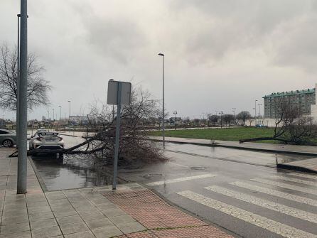 Fuertes rachas de viento han provocado la caída de árboles en el parque del Temple y en algunos barrios de la ciudad como La Rosaleda. Los bomberos se afanan en atender las llamadas que se multiplican por desprendimientos, caídas de cascotes y también inundaciones en, prácticamente, todos los barrios del casco urbano.