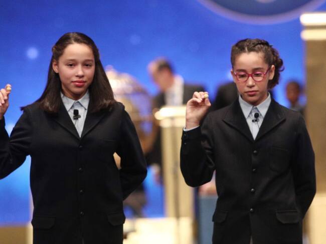 Las dos niñas de la residencia de San Ildefonso posan con las bolas correspondietes al Primer Premio de la Lotería de Navidad, el Gordo de la Lotería, con el nº 26.590, el cual ha salido durante el canto de la cuarta tabla de la Lotería de Navidad / Eduardo Parra - Europa Press (EUROPA PRESS)