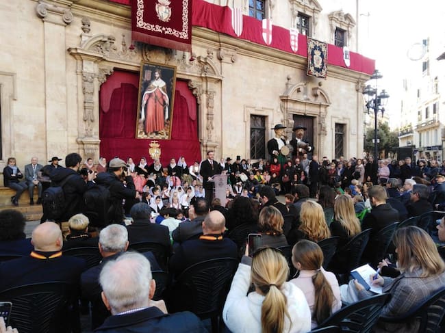 La conmemoración este martes de la entrada en Palma de las tropas de Jaume I en 1229 ha comenzado con la colocación del Estendard Reial y de la Cimera del Rei Martí, a la que han sucedido una misa en la Catedral y la representación de "La Colcada" en la plaza de Cort.