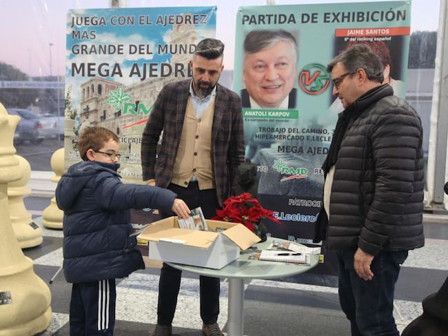 El ex campeón mundial ruso Anatoli Karpov, leyenda viva del ajedrez, se enfrentará mañana al Gran Maestro Jaime Santos, número 6 del ránking español, en una partida-exhibición en la que harán equipo con dos pequeños aficionados: Daniel Giganto, de 7 años y que hará equipo con Santos, y Einar Urdiales, de 8 años y que hará equipo con Karpov. La cita tendrá lugar en el tablero más grande del mundo instalado en el aparcamiento del hipermercado E-Leclerc, a las 18.30 horas. Para la partida del sábado 4 (parque infantil de El Corte Inglés, 18:30 horas) María Olego, de 12 años, hará equipo con Santos, y Ángel Martín, de 10 años, será el socio de Karpov.
