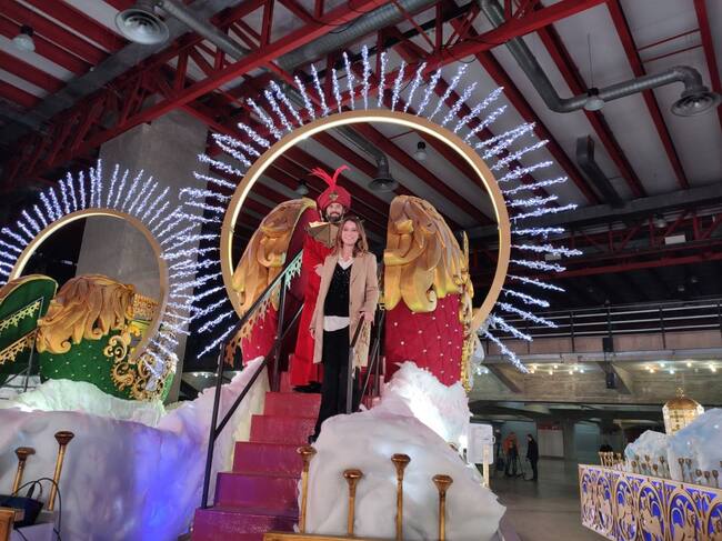 La delegada de Cultura del Ayuntamiento de Madrid, Andrea Levy, junto al emisario real en una de las carrozas de sus majestades los Reyes Magos. / Cadena SER