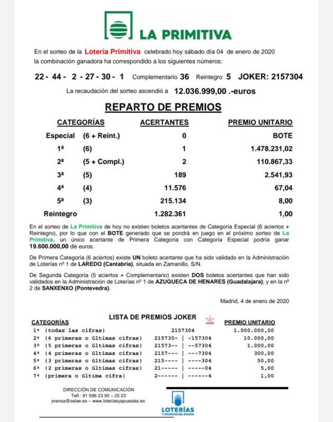 No hubo ningún acertante de categoría especial y tan solo un boleto de 1ª categoría en Laredo (Cantabria). De 2ª categoria hay dos acertantes, el de Azuqueca y otro sellado en Sanxenso (Pontevedra).