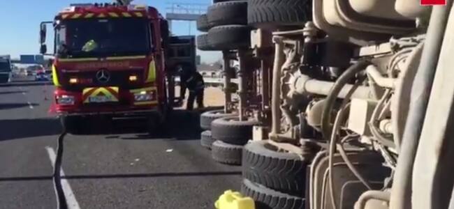 El vuelco del camión dejó atrapado en la cabina al conductor que ha sufrido heridas leves. / @112cmadrid