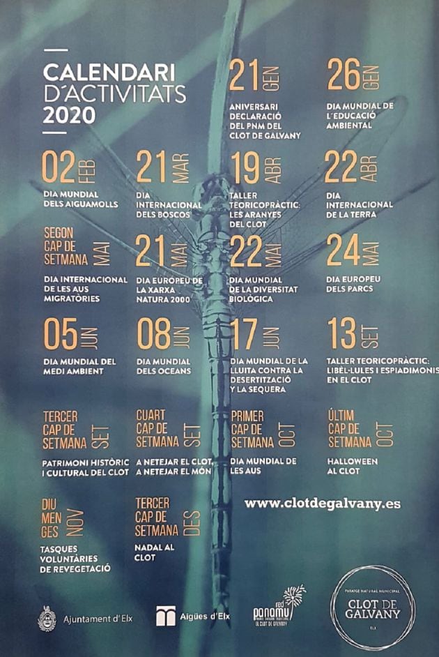 Se han organizado un total de 32 actividades distribuidas en 24 fines de semana. Se trata de talleres preparados para toda la familia entre los que destaca uno para conocer las arañas que habitan en el Clot de Galvany. El conservador del paraje, Juan Carlos Aranda, ha recordado que el año pasado la novedad fue un taller destinado a conocer las libélulas que registró tantas inscripciones que hubo gente que se quedó en lista de espera.