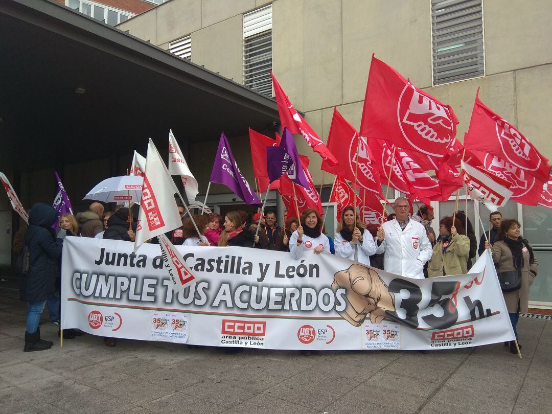 Los empleados públicos de la Junta de Castilla y León han vuelto a concentrarse, en esta ocasión a las puertas del Hospital Río Carrión, para reclamar a la administración regional la vuelta a la jornada laboral de 35 horas semanales, recuerdan que esta medida, al contrario de lo que asegura el ejecutivo, no sólo no tendrá un coste importante sino que permitiría la incorporación de muchos jóvenes a la administración regional. Piden a Fernández Mañueco y a Igea que se dejen de tantas fotos y se dediquen a cumplir los acuerdos firmados.