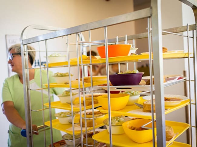Una trabajadora recogiendo las bandejas de comida en una residencia de mayores / Getty Images