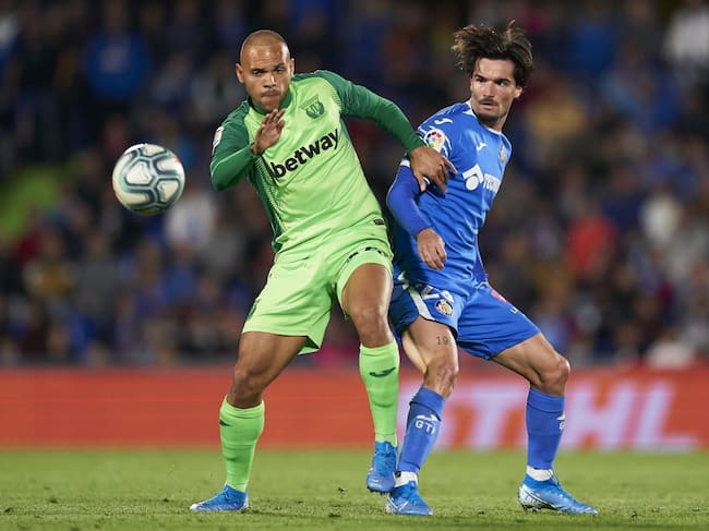 Braithwaite (Leganés) y Jason Remeseiro (Getafe) pelean por un balón durante el derbi de la primera vuelta en el Coliseum. / Quality Sport Images/Getty Images