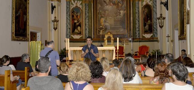 Momento de una visita guiada a la Iglesia de N.S. de La Asunción de Valdemoro, donde se observa el retablo. La tabla de la derecha de la imagen es la 'Aparición de la Virgen a San Julián' de Francisco de Goya. / Ayto. Valdemoro
