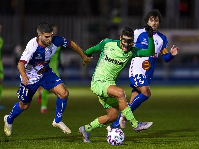 El pepinero Rosales (que lució una aparatosa máscara) conduce el balón perseguido por Juampa (CD Ebro) en el partido de este jueves en Zaragoza. / Quality Sport Images/Getty Images