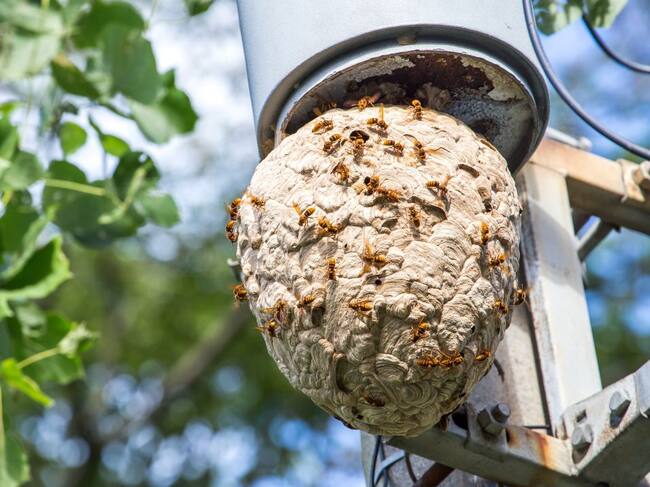 Un nido de avispa asiática junto a un poste. / Getty Images