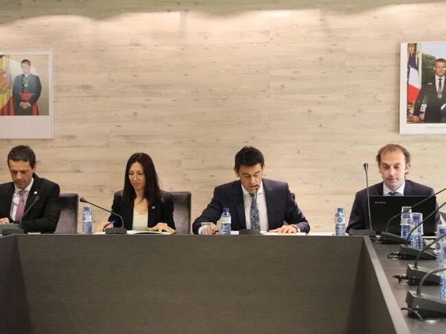Josep Àngel Mortés, cònsol major, i Eva Choy, cònsol menor, presideixen la sessió de consell de comú d'Ordino. / A.S. (ANA)
