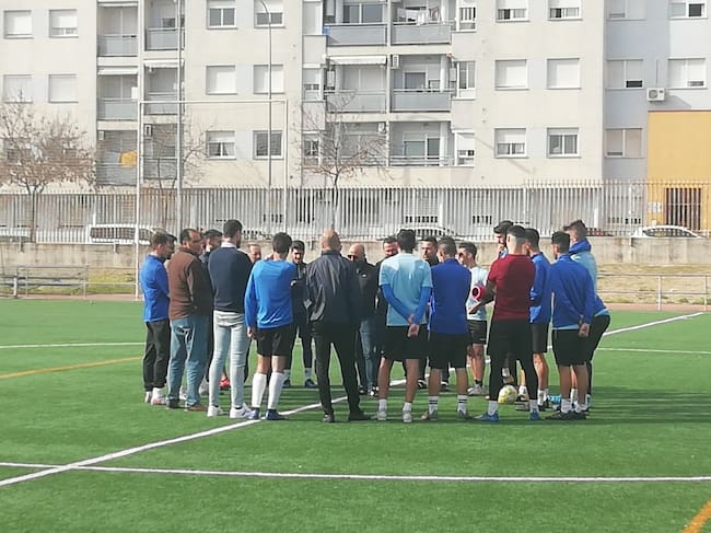 Momento de la charla de Titin con la plantilla tras el entrenamiento / Radio Jerez Cadena SER