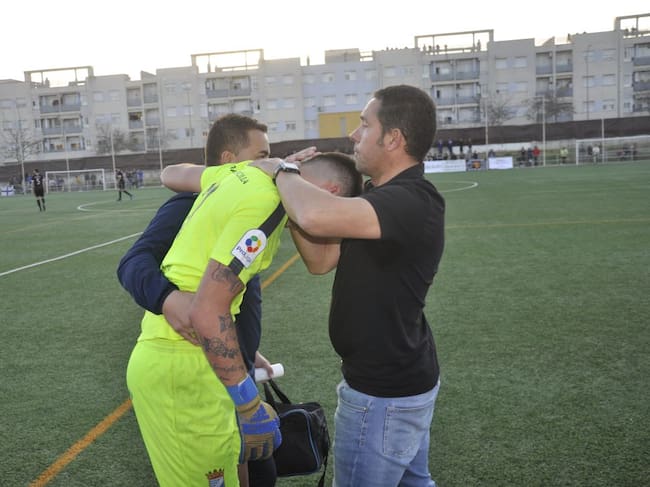 Juanma Cámara consolado por Juan Carlos Gómez al ser retirado por lesión / Radio Jerez Cadena SER