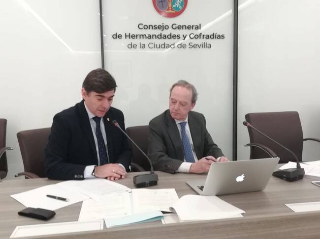 El tesorero del Consejo, Alejandro Marchena -a la izquierda de la imagen-, junto al notario Ignacio Guajardo-Fajardo durante el sorteo de las sillas libres en Carrera Oficial / @ElConsejoSev
