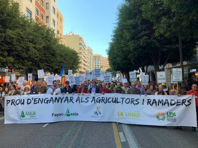 El sector agrícola ha sacado este viernes músculo en València y hasta allí se han desplazado, según cifras de la organización, más de 1.000 agricultores alicantinos, que han salido desde distintos puntos de la provincia para repetir que "el campo está agotado y harto de perder dinero con las cosechas".