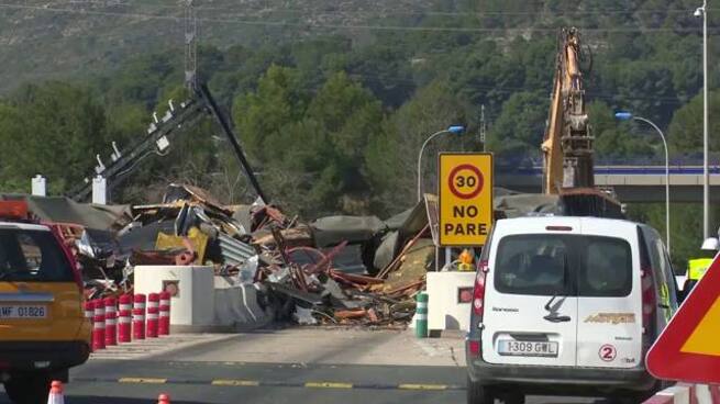 Demolición de las casetas de peaje de la AP-7 en la Safor. Es sin duda la imagen del día, de este 21 de febrero, que muchos se ha encontrado al acceder a la autopista.