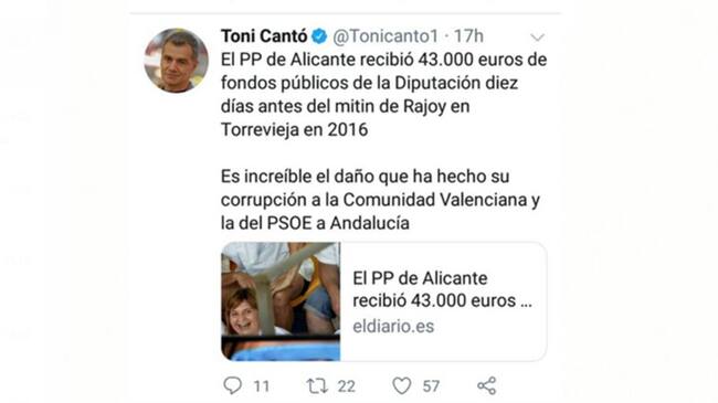 Tuit de Toni Cantó, borrado horas después, donde critica la corrupción del PP en la Comunitat Valenciana. / Cadena Ser