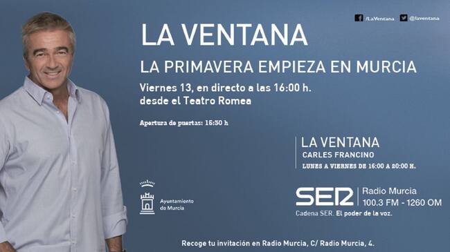 La Cadena SER lamenta comunicar el aplazamiento del programa La Ventana de Carles Francino, que se iba a realizar desde el Teatro Romea de Murcia este viernes 13 de marzo.