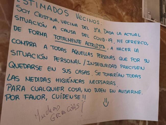 La veintena de vecinos se han mostrado sorprendidos por el cartel que han encontrado a la entrada del portal y muy agradecidos por el gesto de esta gijonesa que está culminando un grado de Terapia Ocupacional en Madrid. La historia de Cristina es una de tantas que se están repitiendo por toda la geografía española. Ciudadanos anónimos que ariman el hombro para ayudar a aquellos que por cualquier circunstancia lo necesitan.